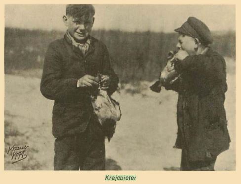 "Einer der bekanntesten Krajebieter um 1900 war der 'Vogelfalk', er ist später ertrunken. Ein mir bekannter Gastwirt in Königsberg / Pr . (Hufen) erzählte, daß er oft gebratene Tauben verabreichte. Bei ihm eingeladen, habe ich auch eine mit Genuß verzehrt. Später berichtete er mir, es sei eine Krähe gewesen. Ich kann mir denken, daß so manch ein Besucher oder auch eine Besucherin sich heute noch den Gaumen leckt, denkt man an die gebratenen Tauben auf den Hufen. Wichtig war jedoch, daß der Perzel (Bürzeldrüse) weggeschnitten wurde. Besonders junge Krähen, die gerade flügge geworden waren, schmeckten am besten. Wir Jungens haben zu Hause in Großheidekrug auch Krähen gefangen und nach Hause gebracht zum Kochen. Meine Mutter hat sie dann auch gekocht und mit Sahne abgeschmeckt. Gegessen haben aber nur wir Jungens. Unsere Eltern sagten sich: „Wat de Bua nicht kennt, dat frett he nich." Die Krähen, die wir fingen, wurden allerdings mit dem Messer getötet, denn den Kniff wie die ,,Krajebieter" kannten wir nicht."